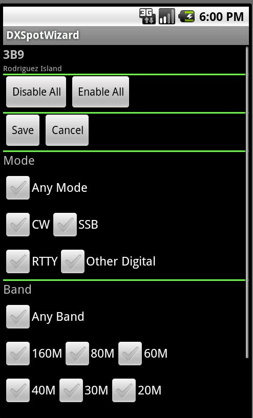 After configuring a prefix, be sure to key either "Save" or "Cancel". If "Save" is not clicked, your changes will not be saved. "Disable All" disables all modes and bands while "Enable All" enables all modes and bands. "Any Mode" selects all bands, while "Any Band" selects all bands. You can optionally use the individual mode and band selections. (Note that the figure is truncated, but the screen includes all HF bands plus 6 meters.)