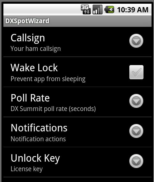 The DX Spot Wizard is an Android app for filtering spots from the DXSummit web site. This page tells you how to configure the application. Run the application and use the menu key to access the setup screens. The primary setup menu looks like this: