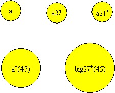 <name> is a string representing the name of the atom, e.g., “a”. Optional label items are enclosed in brackets ([ ]). To refer to a group of similar atoms, the unique id can be omitted. However, to specify an individual atom, the id must be included. The optional plus sign indicates that the atom is charged, i.e., it will not bind with other atoms that are charged. The charge concept is simple: There is no negative charge. Finally, m is the mass of the atom. Figure 1 shows some examples of atoms using this notation.
