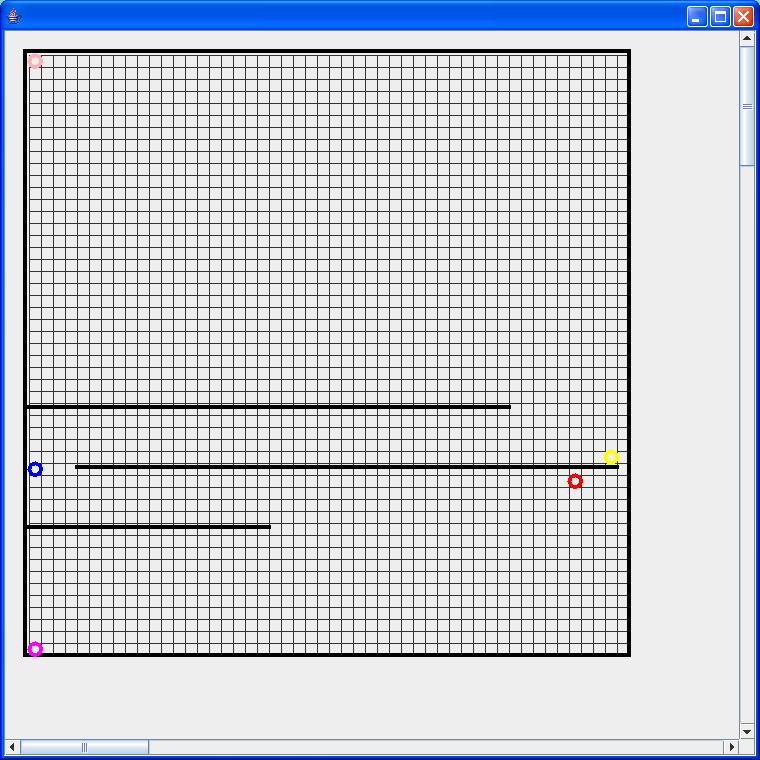 This image shows the end of a simulator run where "Maze 1" has been solved by 3 robots. There are fixed repeaters/beacons in the bottom left and top left grid positions. The other three robots start in the vicinity of the at the lower left and move into position so that messages can be passed between all the robots and beacons, either directly or through repeater action.