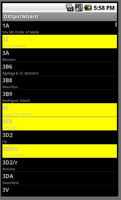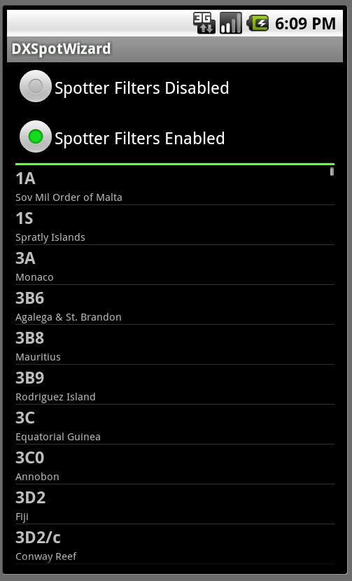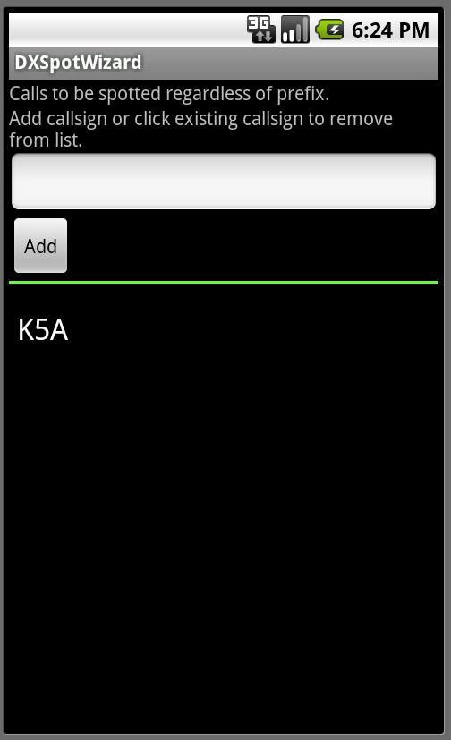 For special callsigns, the app might not be able to determine the entity from the callsign, e.g., North Cook and South Cook callsigns typically do not indicate the entity. The "Special Calls" setup lets you add the callsigns that you want spots for in addition to your prefix settings. Use the text box and "Add" button to add a callsign or click on a callsign you wish to remove.