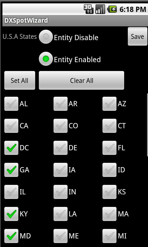 To disable or enable the spotter state filter, click either "Entity Disable" or "Entity Enabled" and click "Save". You can then select the individual states from which you want spots. The setup screen for Canada is similar.